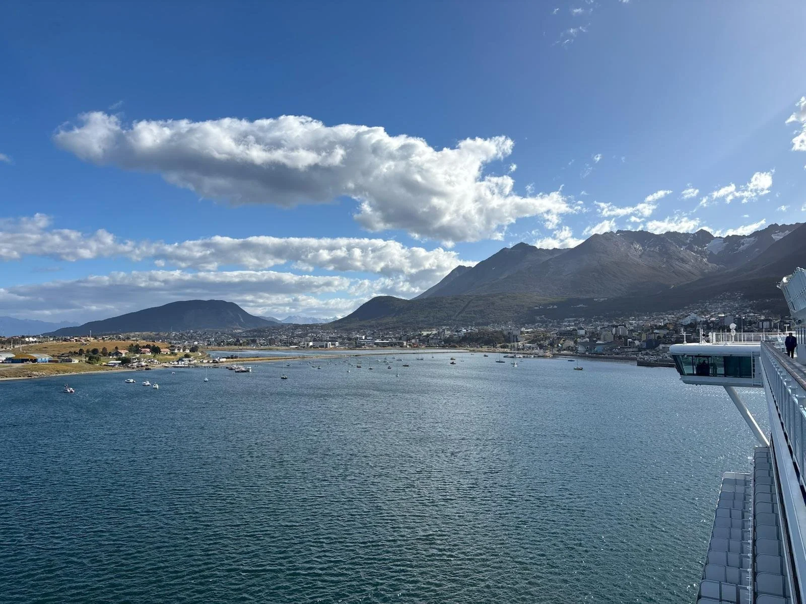The next day lands us in Ushuaia, Argentina (Tierra del Fuego), and here it is pure magic. We booked an excursion here to see penguins since we were not able to do so in Puerto Madryn. (our redemption!) I am excited to spend some time on a smaller vessel, be on the water and have a day of it. The day is absolutely stunning! Clear, blue skies and warm-ish weather, and the sea is calm. It is here on this day that is the highlight of my entire 6 month adventure. There was an energy and vibration that I can still feel today, and it was the most glorious peace on the land and water. Ushuaia is the farthest town south of the equator and considered the “end of the world,” and I was smiling all day long. The excursion was fantastic, we saw a smattering of penguins on a tiny island, and we had about an hour to walk around the town after the tour before needing to board the ship. Then, we had over two hours of pulling out of port with the most incredible views of the land, sky and sea that spoke to our souls. We were on the top deck, Tim sat in the hot tub, I had music in my ears, and we took in the energy and beauty of this incredible place. I was very aware to be present with all that was here for me, and all of this seeped into my cells to be carried with me forever.